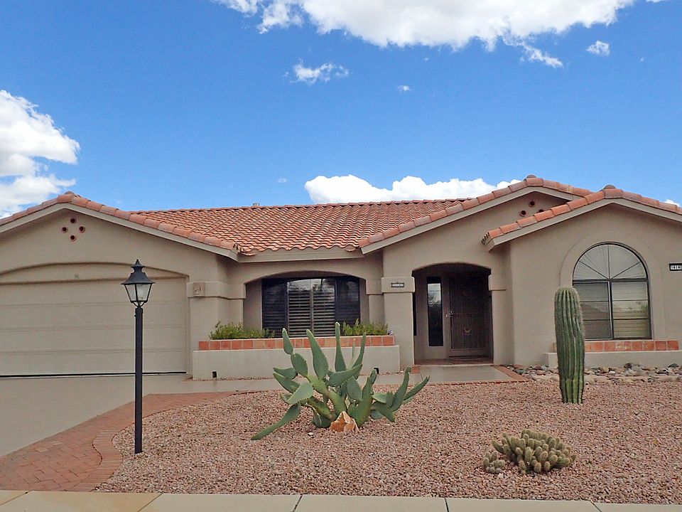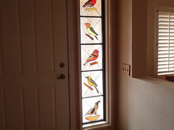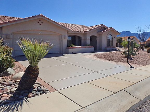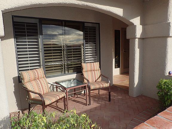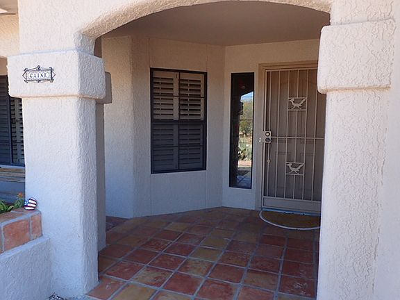 Pacifica model with remodeled pantry and kitchen, all cabinets and counters in kitchen, the Arizona room, and the bathrooms have been refinished, A stained glass desert scene is in the master bedroom and the sidelight of the front door has a stained glass panel of 5 local birds. The patio faces the Catalina Mountains and features a CalFlame built-in stainless steel grill. Both bedrooms, the dining-living room, the Arizona room, and the kitchenette have ceiling fans, as does the covered patio. A large gun safe is bolted to the floor of the garage.