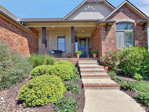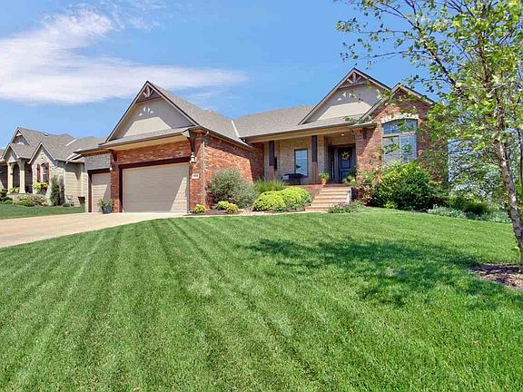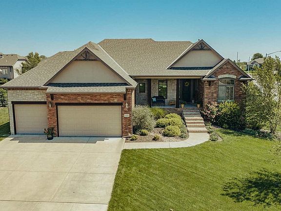 This beauty, right out of a magazine, is ready to be called your HOME. Fall in love with this Nies build with an open concept, gorgeous vaulted wood beams, luxurious granite & tile, wood floors and trendy chandeliers and light fixtures. It's truly a stunning home the moment you pull up. Brand new roof in October! Professional landscaping all around, fully fenced with a large patio and sport court including a high end basketball goal, as well as a covered composite deck. The details on the home with the cedar trim and gorgeous stone around the front porch will catch your eye. The kitchen is a showstopper. It has a walk-in pantry that EVERYONE wants in their home, a HUGE granite bar perfect for easy meals and entertaining, as well as GE stainless steel appliances including a gas stove & brand new dishwasher. Dark cabinets with an offset white island color make this home right on trend. Tucked off to one side of the home you'll find the private hallway entrance to the master bedroom as well as to the full master bathroom with beautiful finishes of Corian and tile and also a soaker tub and a huge stone shower with 2 shower heads. Don't miss the unique coffee bar that can be used as another drop zone. This customized master closet has the California feel with 2 built in units and tons of hanging space. Two more gorgeous bedrooms and a hallway bathroom as well as a large separate laundry / mud room and ½ bathroom make up this main level. Downstairs you'll find a spacious family and game room for entertaining along with a full wet bar with a sink and refrigerator. Access to the backyard from this walk out basement provides even more entertainment space. You'll find 2 more bedrooms and another bathroom and a huge storage room that was planned for a future theater room but is currently used as a workout room. Surround speakers throughout the house and covered deck. Did I mention this home has an irrigation well and sprinkler system? Keep your yard looking beautiful year round. This home is truly move in ready. Sedgwick County taxes, Andover schools. Win win!