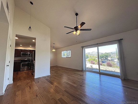 Charming single level home in sought after Poway. End unit with incredible views of the mountains with vaulted ceilings. Dual pane windows, central AC, newer kitchen cabinets w/stainless-steel appliances. Engineered hardwood floors in the main area, updated bath with tile shower surround. MB features vaulted ceilings and walk in closet. Unit includes additional storage area steps away front door and 2 assigned parking spots. Community Pool. Laundry in unit. Close to retail. Walkable neighborhood.