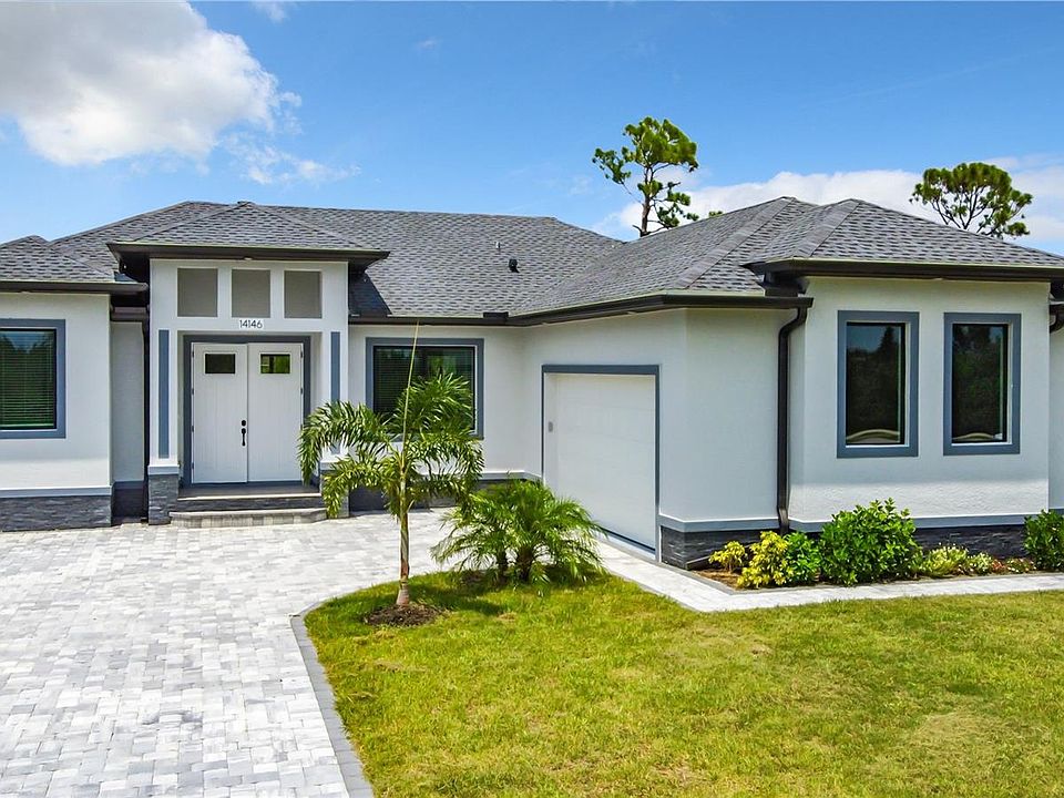 This stunning home has 3 bedrooms, 2 bathrooms and an over sized two car garage. Its open floor plan is move-in ready, and gleams with pride of ownership inside and out! Come in and youll be welcomed into the enormous living room with 10ft high ceilings and spectacular view through the tall windows and doors! The gorgeous and spacious kitchen is adjacent to the lovely dinning room and features Granite countertops, plentiful counter and cabinet space. The spacious Master bedroom features 10ft tall ceilings for comfort and offers a large walk-in closet and its very own en-suite bathroom with his and hers sinks, and separate tub and shower! This home is packed with features inside and out, hurricane windows and doors, oversized driveway and garage, and insulated interior walls, and attic. Enjoy your evenings outdoors in the large covered lanai thats hookup ready for an outdoor kitchen, and an outdoor shower for your future pool! Located in beautiful South Gulf Cove, with a community park and boat ramp with Gulf access. Come and enjoy world renowned Gulf beaches of Southwest Florida and many other amenities! Seller is also offering a 3 year home warranty.