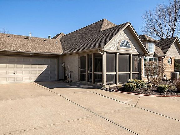 One-level, maintenance-free living at its best! Nestled in peaceful and popular St James Court, this ranch-style villa is surrounded by shade trees with the fabulous club house and neighborhood pool nearby. The neighborhood is conveniently located near shopping, restaurants, parks, and the Olathe Farmer's Market! Enter the home to a large living area with a gas fireplace and ceiling fan. The newer, large, gorgeous windows, fresh interior paint, updated lighting and fixtures, plantation shutters and vaulted ceilings throughout make the home spacious, light, and bright. The living room opens to an updated kitchen with hardwood floors, granite counters, a tile back splash, stainless appliances, bar seating, a desk area, and two large pantries. Off the kitchen is a beautiful dining area which steps out onto a serene, screened porch with a new ceiling fan and newer sliding door. The generous primary bedroom adjoins a large bathroom with a HUGE walk-in closet, tile flooring, a double vanity, a separate shower, and a large, soaker tub. The second bedroom features two closets and built-in shelving, and it is adjacent to a full bathroom with a step-in shower. The home also boasts a handy laundry room and an oversized two-car garage with shelving and plenty of extra storage space. All appliances including washer, dryer and refrigerator stay with the property!