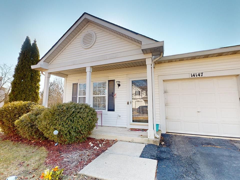 Welcome to this charming half duplex in Lakewood Falls, offering 2 bedrooms, 1.1 baths, and a host of updates, making it move-in ready and stress-free! As you arrive, you're greeted by a tranquil covered front porch, setting the tone for what lies within. Step through the front door into the inviting living room, featuring dramatic vaulted ceilings, a rare fireplace (a unique feature within the subdivision), and gorgeous newer wood laminate flooring. The foyer includes a generous coat closet for added convenience. Adjacent is the combined dining room, spacious enough to accommodate a sizable table, with a sliding glass door leading to the side yard. The updated kitchen is both spacious and functional, boasting navy painted cabinets, a stainless steel refrigerator, and solid surface countertops with a newer sink and fixture. The master bedroom offers a retreat with vaulted ceilings, a large window, and ample closet space. The master half bathroom features a generous vanity area and connects to the shared tub room, conveniently located near the guest half bathroom - a thoughtful layout indeed! Bedroom two continues the theme of vaulted ceilings and offers another sliding door leading to the backyard, a unique feature not found in all units. The laundry room includes newer washer and dryer, mechanical area, nearly new water heater and provides access to the attached 1-car garage. Outside, the extra-large fenced backyard awaits, complete with a charming gravel patio area, perfect for cozy bonfire evenings. Lakewood Falls is a vibrant community filled with parks, ponds, and lakes, offering residents a serene environment. Conveniently located near Weber Rd., residents enjoy easy access to I-55, shopping, schools, and more. This meticulously cared for and updated townhome is truly a must-see. Welcome home to Lakewood Falls!