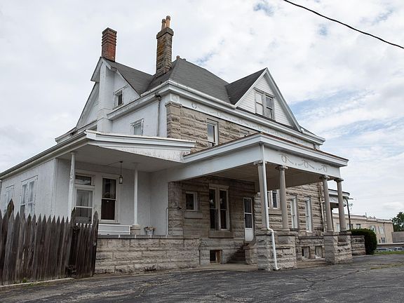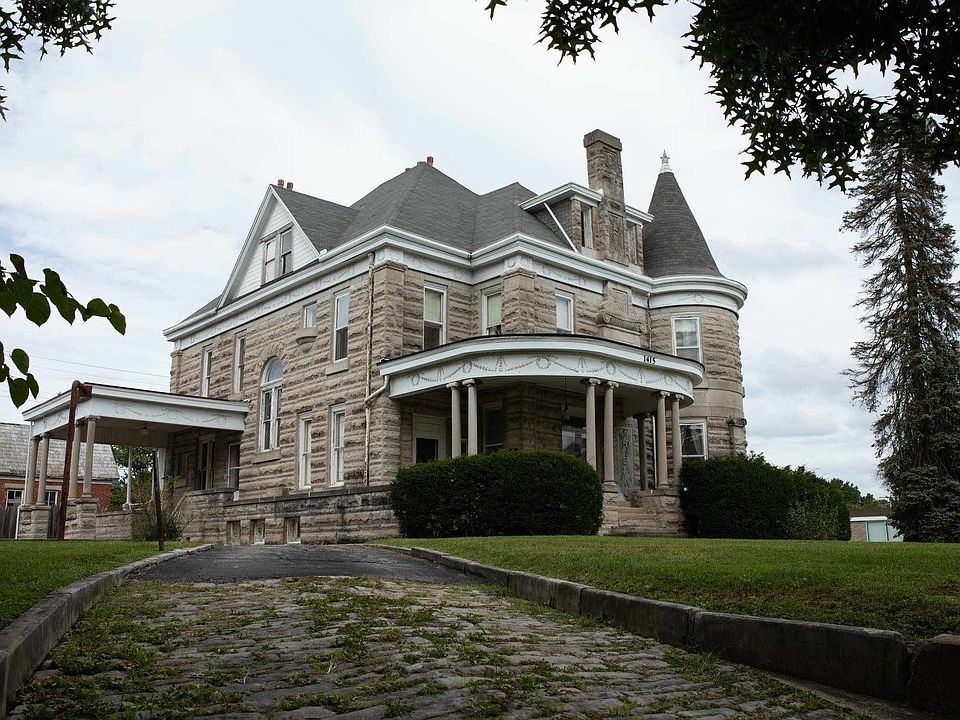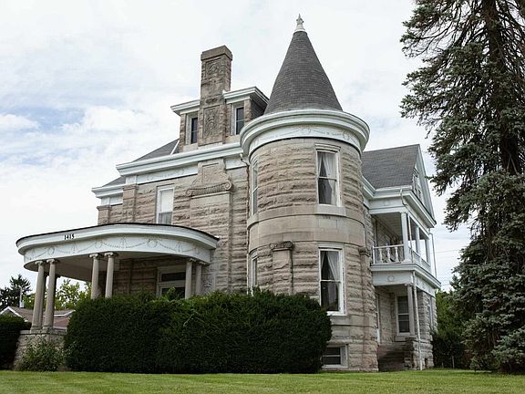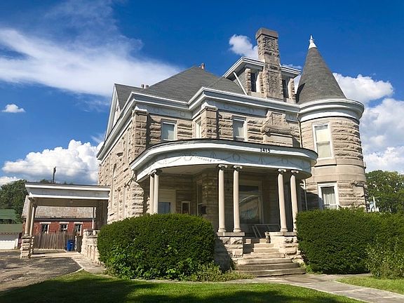May I have the pleasure to introduce you to the "C.S. Norton Mansion", located in Bedford Indiana. Built in 1897, this 2 1/2 story "royal blue" dwelling home was listed into the US National Registry of Historic Places in 1976. The home boasts of over 5000 sq ft of living space with 5 Bedrooms and 3.5 Baths. There are dual front entrances and a parapet surrounding the roof. It is cubicle in form with a hipped roof and gable dormers. The house features a cylindrical tower topped by conical roof, a one story entrance portico with Ionic order columns, and a porte cochere. This home is well known in Bedford as the "Limestone Castle". The limestone came from Mr. Norton's quarry that was known for a special blue hue. There is also a detached brick building that was once used as living quarters while the house was being built and later servant quarters.