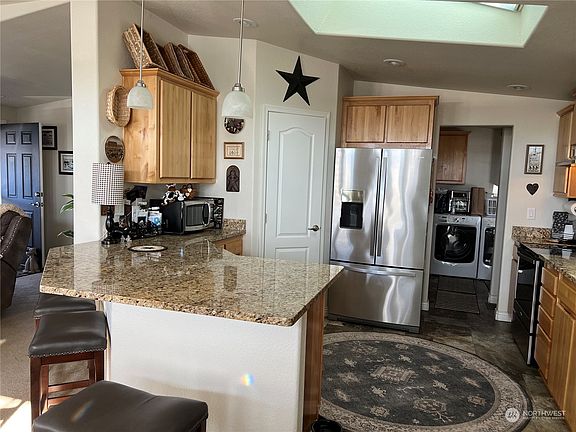 Stunning home Mobile Country Club, everyone's favorite 55+ mobile park. This beauty built in 2015 sits on a premier lot w/mountain & sunrise views. Watch hot air balloons & sky divers from Snohomish. Custom blinds/cellulars w/remote, granite, SS kitchen with breakfast bar. Kitchen opens to formal dining area and oversized living room, den. Guest bedroom has walk in closet. Primary suite has grand bath area with two sinks, oversized shower and plenty of closet space. Door in primary suite has a storm door & hidden screen that leads to private Trex deck, hot tub and Sunsetter automatic awning. Home has heat pump w/AC. Oversized storage shed w/power and storage, freezer remains. Low maintenance gardens surround home. Marlette Majestic.