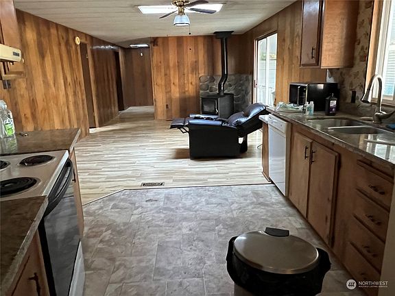 Spacious home in everyone's favorite 55+ Park, Mobile Country Club. Great location, corner lot in back of park. Sunny lot, loads of natural light, professional grade ramp access, updated kitchen counter tops. Wheelchair access to ramp; living areas, doors and wide hall ways wheel chair accessible, walk in shower with bars. Wood stove in country kitchen. Large rooms for all your furniture. Large deck on front of home. Come make this your own. Great location, close to shopping, Freeways and Boeing. Guest parking adjacent to lot, dog park access and walking trails. Seller is selling in "as is condition".