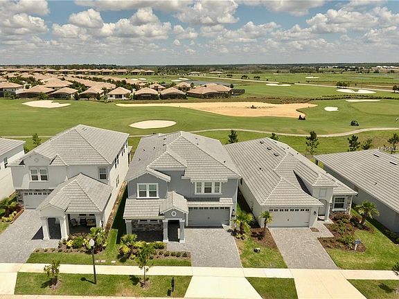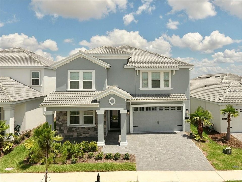 EXCELLENT PRICE! SELLER'S LOSS IS YOUR GAIN . . Stunning home in Oasis Club/Championsgate golf community. This amazing home is located on the 17th fairway. The open floor concept boasts 5 bedrooms, 4.5 baths, office/study, and bonus room. Transitional decor throughout with gray cabinetry and quartz countertops. The kitchen has matte stainless appliances, island, dry bar and overlooks the dining and great rooms. Wood-look porcelain tile runs throughout the downstairs. There are two master suites, one downstairs and one upstairs - both have spacious bathrooms and closets. Also a laundry room on each floor. The upstairs features 4 spacious bedrooms (two ensuite), and a spacious bonus room. The covered/screened lanai overlooks the pool/spa and beautiful views of the 17th fairway and green. This home has many upgrades including video cameras, draperies, crown molding throughout and much more. The golf cart is also included.