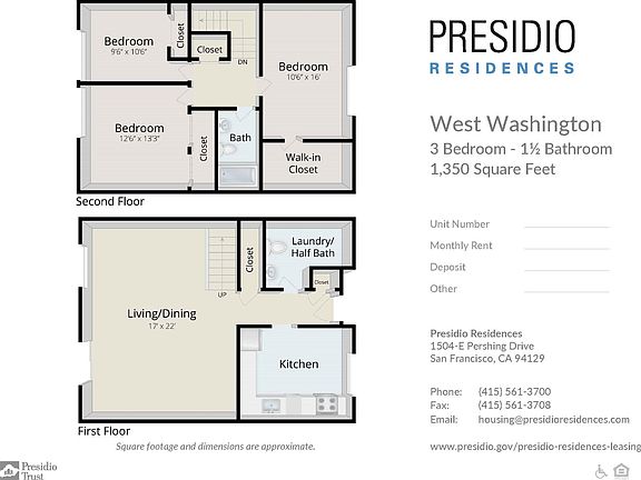 Do you need some extra space to work from home? Maybe one more bedroom will do the trick? The Army built their housing to accommodate larger household sizes, and the West Washington Neighborhood might be what you are looking for, featuring 3 bedroom units. This is a remodeled 3 bedroom, 1.5 bathroom unit that comes to 1300 square feet of space. The unit features washer and dryer hookups and designated parking. The neighborhood has stops for the PresidiGo, a transportation system, free to park residents, offering service throughout the Presidio National Park and downtown San Francisco. Located at the park's highest point, the West Washington neighborhood sits between the panoramic Pacific Ocean to the west, the fairways and greens of the Presidio Golf Course to the south, and the Presidio's historic forest to the north. These townhomes offer large kitchens, ample storage, and private outdoor spaces for barbecues and stargazing. The West Washington neighborhood is also near the 25th Avenue Gate with easy access to the western shoreline and the wild coastal bluffs. The community offers spectacular views of the Pacific Ocean, Sea Cliff, and the Marin Headlands. The West Washington neighborhood is a short distance from the shops and restaurants of the California, Clement, and Geary Street retail corridors, as well as the Palace of the Legion of Honor. For the outdoor enthusiast, the California Coastal Trail and Lobos Creek Valley are just steps away. Security Deposit is one month's rent at market rate. Price reflects a twelve-month lease with a move-in date within ten days. Other options are available: please ask your leasing agent about terms. Pricing may change daily. Two Pets are permitted per household with a $500 pet deposit per pet. Equal Housing Opportunity. We are available for private viewings M-F 9-6 and Sat. from 10-4. A photo ID is required to tour.