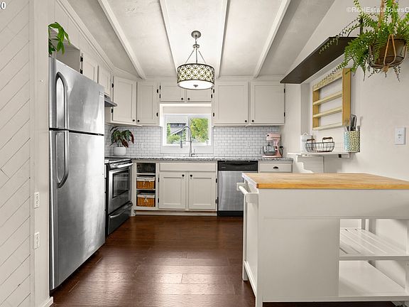Charming 1930's Cottage! This single level home features wood beamed ceilings & laminate wood floors throughout w/ new carpet in all 3 bedrooms. The renovated kitchen w/ new cabinets, granite, subway tile & s/s appliances opens to a family room. 2 full baths & rare oversized 2 car garage w/ room for rv/boat parking on side of home. Roof 4 years old. New driveway, sidewalks & front path coming soon. Walkable to downtown Newberg w/ restaurants, coffee shops & pubs & close to parks & University.