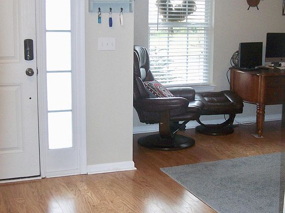 Engineered hard wood floor throughout the entire house with vinyl tile looking floor in baths. The continuous open floor plan of this house is perfect for entertaining. As you enter the home you have the perfect space for an office, formal dining room or even a play area for the kiddo. The kitchen boast newly painted cabinets, solid surface countertop and stainless steel appliances along with a huge pantry. Off of the kitchen is a bar along with an eating area which is open to the living space. The enormous sliding glass door helps continue the inside living space to the outdoors which encompasses a covered and open patio. Master bedroom is on the back of the home with a beautiful bath along with a massive walk in closet. The 2 other bedrooms are spacious with large closets.