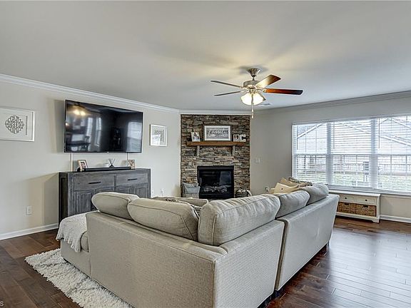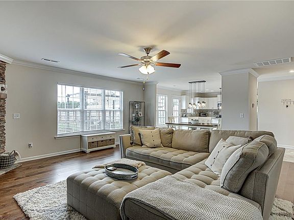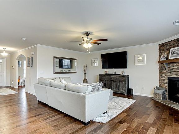 Delightful & filled w/ upgrades! MOVE IN READY! Hardwood floors, tray ceilings, stone fireplace & open design! Designer kitchen has granite topped counters, island, porcelain farmhouse sink, chic lighting, walk-in pantry & laundry room. Arched entry leads to LR/office/dining room. Owner's suite has tray ceiling, deep walk-in closet, garden tub, tile shower & dual sinks. Three additional bedrooms plus a full bath w/ dual sinks! Enlarged patio, fenced bkyd! Community playground/Future walking trails.
