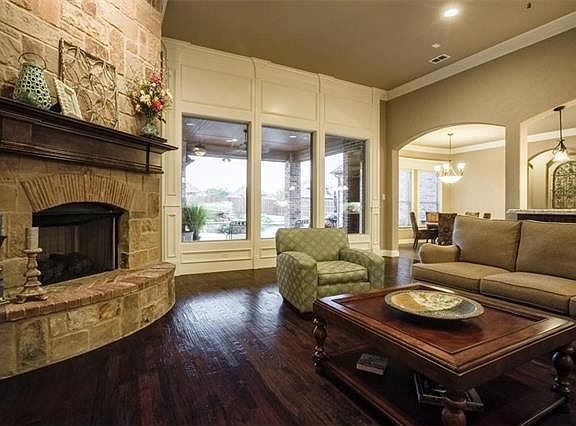 Absolutely GORGEOUS Home on Corner Lot in The Meadow~Stunning Hand-Scraped Hardwood Floors~Extensive Crown Molding~Picturesque Views of Both Fireplaces w Gas Logs~Gourmet Kitchen w Upgraded Granite, HUGE Island, Double SS Ovens, 5-Burner Gas Coooktop, Pot Filler, Touch Faucet, Walk-in Pantry, Coffee-Wine Bar & Stone-Brick Bar Surround~Flex Room Could be 4th Bdrm, Gameroom, or 2nd Living~Salt-Water Pool w Grotto, Jump Rock, Spa w Step-up & Firepit