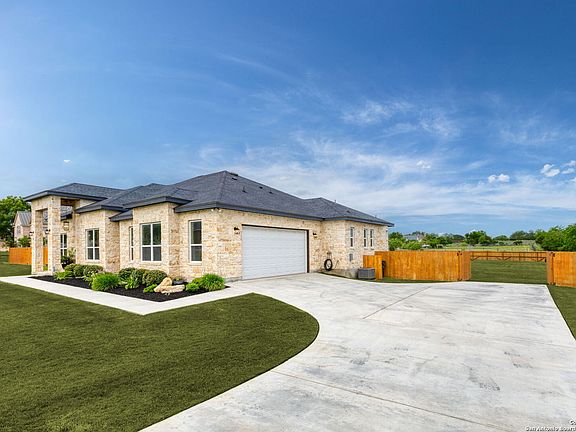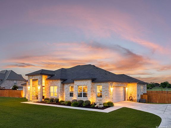 Discover Hill Country Elegance at The Crossing at Spring Creek - Your Dream Home Awaits! Welcome to a luxurious escape where grace meets comfort in the heart of the Hill Country. Nestled within the serene enclave of The Crossing at Spring Creek, this magnificent 4-bedroom, 2.5-bath residence offers an unparalleled living experience on a sprawling 1.12-acre lot. Here, your backyard seamlessly extends into a 131-acre ranch, creating a private sanctuary with breathtaking views and abundant wildlife. Step inside through the exquisite Cantera Style front door and be greeted by an expansive open floorplan illuminated by natural light streaming through numerous windows. High ceilings, soaring to 10 feet, accentuated by rich dark wood beams, evoke a sense of elegance and warmth synonymous with Hill Country charm. The heart of the home is a chef's paradise - a gourmet kitchen equipped with top-of-the-line stainless steel built-in appliances, granite countertops, and soft-close cabinetry. An island with a vegetable sink and undermount cabinet lighting enhances both style and functionality, while an inviting coffee bar area invites moments of relaxation. Adjoining the kitchen, the dining room boasts lofty ceilings and a built-in buffet, perfect for hosting unforgettable dinners. Retreat to the primary suite, where luxury blends seamlessly with tranquility. Whether you unwind in the spacious bedroom or enjoy the cozy ambiance provided by an outdoor stone fireplace, this space offers a haven of relaxation year-round. The secondary bedrooms are equally impressive, connected by a Jack and Jill bathroom, each equipped with individual sinks for added convenience. Completely fenced with a convenient boat/RV gate, this all-masonry home is designed for both practicality and privacy. Located in a quiet cul-de-sac, it offers an idyllic setting with captivating views of nature from every angle. The neighborhood enhances your lifestyle with exclusive river access at its park and pavilion, fostering community spirit and offering recreational opportunities. This isn't just a home; it's an invitation to experience the pinnacle of Hill Country living - where every detail has been thoughtfully crafted to create a space that exudes elegance and comfort. Don't miss your chance to make this extraordinary property your own. Book your showing today!