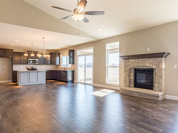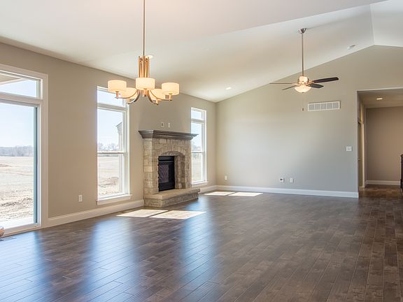 This Ranch Home has 3 Bedrooms, 2 Baths & an Oversized 4 car garage w/ Service door. The home has 9' ceilings w/ a Vaulted Great room & a 16' x 14' Covered Patio. The Kitchen has 42" Staggered Cabinets w/Crown Mold, Cambria Countertops, Stainless Appliances, Large Island w/ Overhang & a huge walk in pantry. The Great rm has a Direct vent gas Fireplace w/Stone front & 6' windows on each side w/transoms above. Laminate Flooring is in the Foyer, Great rm, Kitchen, Breakfast rm, walk in pantry & in the Hallway leading to the bedrooms. Other features include open stairs w/iron spindles, 5 1/4" Base, 3 1/4" door casing, 2 Panel Doors, Upg. faucets, & Upg. front door & sidelights w/transom above. The Master Bedroom has a Coffered ceiling & large walk in closet. The Master Bath has a 5' shower w/ transom above, double bowl, adult height vanities w/drawers. This home also has Can Lighting, Soffit Lighting, Custom Paint, Egress Window, Architectural Shingles & Full Sod.*Pictures Representative of Model