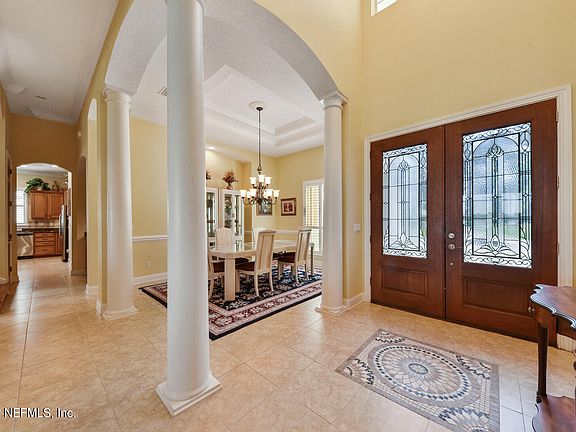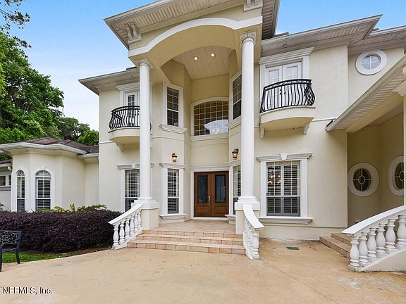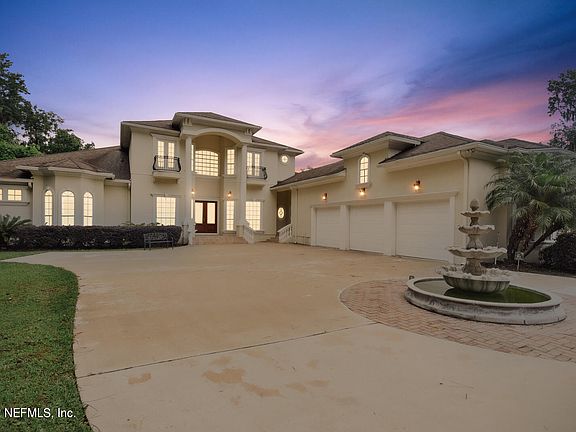 Amazing views of Doctors Lake from this Mediterranean style luxurious custom built home featuring block construction, private gated driveway, oversized 3 car garage, inground screened pool, summer kitchen, massive yard and private dock. Inside you're greeted with soaring ceilings and high end finishes. The owner's suite overlooks the pool/lake, spa like en-suite bath and connected gym/nursery, steps away from another bedroom/office and guest bath. Formal living, bar, dining, breakfast, family room and kitchen all have breathtaking views of the water, are filled with light with open concept living and amazing entertainment space. Another bedroom/bath are at the back of the house leading to the theater room and bath 4. The main staircase leads to 2 more bedrooms/baths, game room and balcony. balcony.