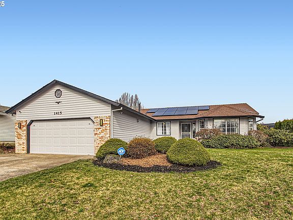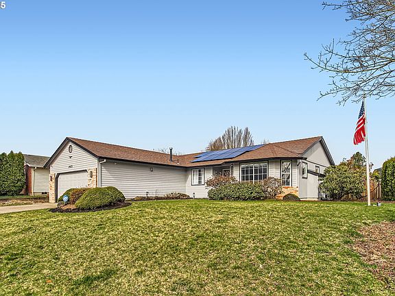 Welcome to your new home in the heart of Troutdale! This charming, single-level, 3 bedroom 2 bath ranch-style home is the perfect blend of comfort and convenience. With local shopping options like Safeway, Walgreens, and Home Depot all nearby, and a variety of restaurants, everything you need is within easy reach. Driving up you will see the large front yard, plenty of parking with the two-car. Once inside you are greeted with a bright and open vaulted living room, dining room and the recently upgraded kitchen. The kitchen renovation features new cabinetry, quartz countertops, a stylish tile backsplash, and under-cabinet lighting, all overlooking the covered patio, backyard, and garden area. All three bedrooms have new carpet, including the primary suite, which features a walk-in closet with a charming barn-style door and a private ensuite bathroom. The primary bath offers plenty of counter space and storage, along with a standing shower for ultimate convenience. For energy efficiency, this home is equipped with a Purelight 8 KW solar system, helping to reduce monthly expenses. Both the interior and exterior have been freshly painted, giving the home a clean and modern feel. As you head to the backyard you will go through the sunroom which is a great flex space for an office, gym, reading nook or extra storage. The backyard is a true retreat, with a relaxing jacuzzi, a covered patio for summer BBQs, and raised garden beds to cultivate your favorite vegetables.