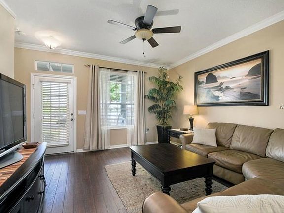 Meticulously maintained with fantastic attention to detail, this townhome with no front neighbors and a peaceful water view in the desirable Eden's Hammock community of Summerport includes hand scraped hardwood floors, 42 in kitchen cabinets, crown molding in the formal area, black appliances, intercom, recessed lighting, 18" tile on floors and shower walls, upgraded carpet and light fixtures and cable in almost every room. The downstairs spacious master includes tub with shower and dual shower heads and walk in closet. The kitchen offers 42"with breakfast bar, island, silestone counters and sliding doors leading to the private paved patio. Laundry hook up, and an additional half bath are also downstairs. Upstairs includes a bonus room with professionally pre-wired MTS surround system, extra electrical outlets in the floor and 2 more bedrooms with a full bath. Enjoy the covered front porch with views of the peaceful lake across the street. Walking distance to Keene's Crossing elementary school and community stores like subway, Publix and other boutique stores and restaurants. This community offers a community pool, basketball, tennis, and lots of sidewalks for walking. Ideally located only 3 miles to the 429 and Fowler Groves which includes Target, Starbucks, etc. Call today!