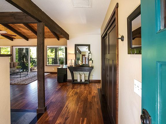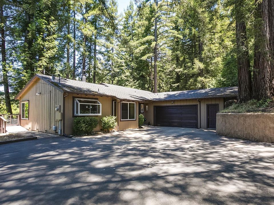 This charming single story home enjoys a serene setting on a gated private road, bathed in sunshine and flanked by majestic redwoods! The interior living space offers an open floor plan featuring vaulted open beam ceilings, imposing stone fireplace, and beautiful quality engineered hardwood floors with 'hand scraped' effect. The kitchen with breakfast bar is open to the spacious dining room with built in cabinetry and wine rack. The living room flows seamlessly to the new and expansive trex deck, with forest views. Home comprises 3 bedrooms & 2 baths, plus wide hallway with built-in bookcases. The master suite opens to the side decks with hot tub and sunny paver patio, terraced gardens and steps up to the knoll by driveway. Workshop/storage room and 2 car garage with drive through door to backyard. This beautifully updated and well maintained home enjoys a private elevated setting with acreage that extends both sides of Old Japanese Rd. Excellent schools - Loma Prieta,CT English, LGHS