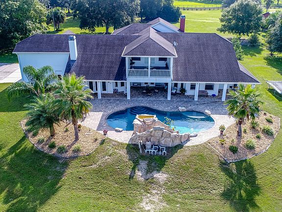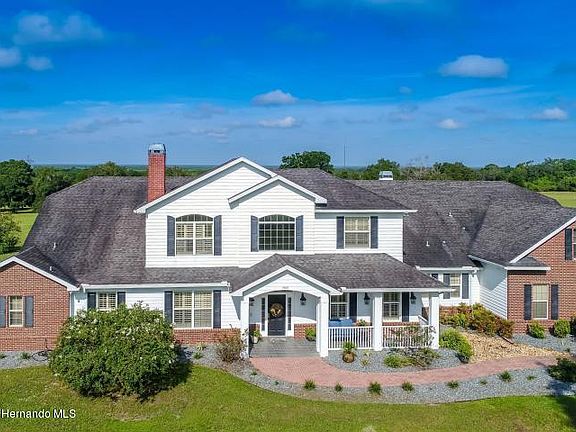 COME FALL IN LOVE! Private gated entrance leads to one of the most IMPRESSIVE CUSTOM-BUILT homes in Hernando County, perched on 42.3 acres of high, gentle rolling, private pasture land with captivating sunset views and in an exclusive area! Inspired by Country French Design, the main home has 5 bedrooms + office + man cave, 2 fireplaces, 5.5 bathrooms, 4-car garage. Its unrivaled outdoor living space includes a Disney-like pool with grotto, waterfall, slide, outdoor granite kitchen & brick pavers. Gourmet eat-in kitchen is open to family room w/gas Thermador appliances, Butler's pantry + huge walk-in pantry, storm room. GUEST HOUSE w/wrap-around porch has 1 bed, 1 bath. Impeccable 12-stall stables w/tack room, 2 wash areas, electric & water. Board fenced. Pristine pastures. Newest Schools