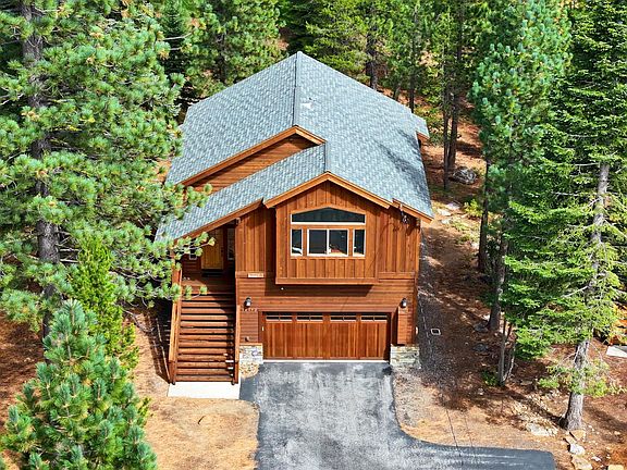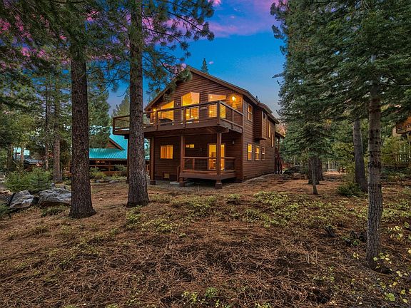 Tucked off the 8th tee box of the Tahoe Donner Golf Course, this newer home on Skiview Loop offers an inviting and open floor plan. The kitchen (sliding shelves throughout), dining area, and great room seamlessly connect, opening up to a spacious back deck that overlooks the golf course. On the main level, you’ll find a serene primary suite and a convenient powder room. Downstairs, there are two additional guest bedrooms, a full bath, and a bonus room with a sliding door that leads to the lower deck, providing even more outdoor living space. With mountain-inspired finishes such as slab granite countertops, hardwood floors and a stunning rock-surround fireplace, this home exudes warmth and rustic elegance. Conveniences include Wi-Fi-enabled 3-zone central heating, fire suppression system an oversized 2-car garage and a large, flat south facing driveway!
