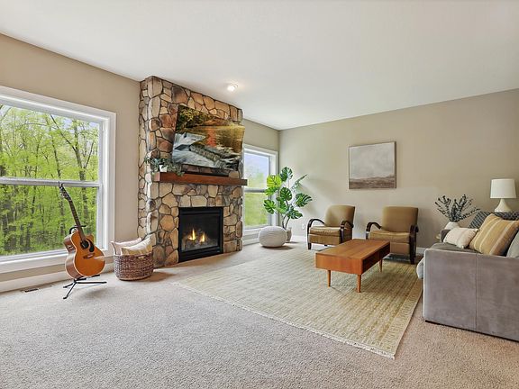 Welcome to the Wilds! This beautiful home is situated in a desirable neighborhood, just minutes away from Jeffers Elementary. As you arrive at the house, you'll be captivated by its charming front porch - perfect for sipping your morning coffee. Inside, rich wood floors and white accents create a warm and inviting atmosphere. The cozy fireplace serves as an eye-catching focal point of the greatroom while offering warmth during cold winter months. Both kitchen cabinets and pantry offer plentiful storage space along with a center island that provides plenty of room to prepare meals and a central gathering space for entertaining. In addition, this home features 4 large bedrooms and 3 bathrooms - making it ideal for those looking for extra living space! The back deck and stone fireplace on the private wooded lot provides a truly peaceful sanctuary. Plus, there's still potential to finish off the walk-out basement to your desired design – allowing you to make this home truly yours!