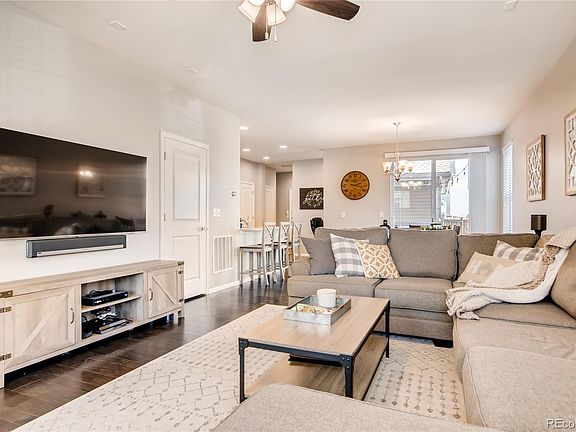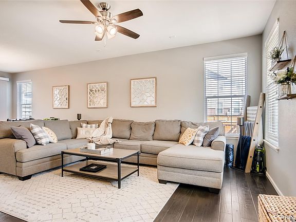 This beautiful 2-bed & loft, 2 1/12 bath is turn key for your buyers. Features include granite countertops, SSA, kitchen office nook, 9' ceilings, engineered laminate flooring, main floor powder room with pedestal sink, upstairs a spacious loft, master bedroom, master bath, 2nd bedroom w/ full bath. Nice size2-car garage w/ ample storage space. Note the beautiful yard and custom oversize patio for entertaining and pets. This home abuts green belt and is located on a corner lot. Location is close to dining, shopping & entertainment. Easy access to I-25 & E-470. So step in and fall in love with this beautiful home.