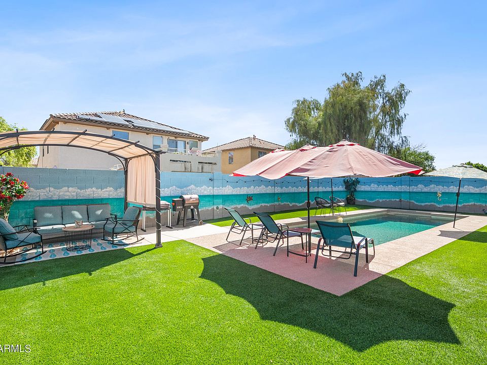 The backyard oasis is perfect for relaxation and entertaining, artificial turf, covered patio, and an inviting self cleaning Pebble Tech pool with brand new heater / cooler