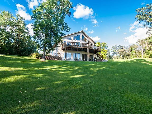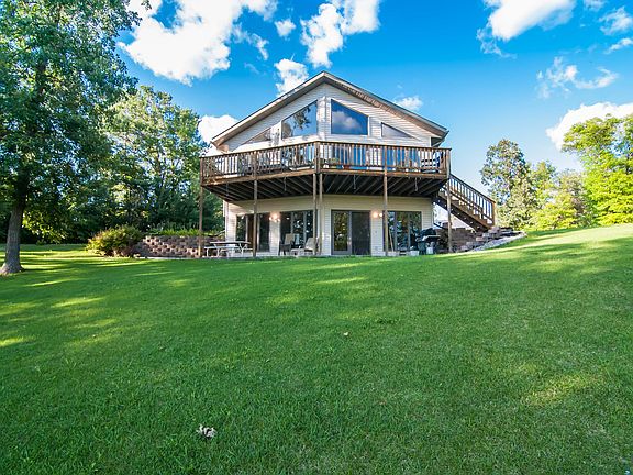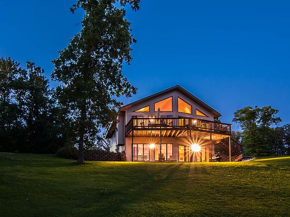 This beautiful year round lake home has 5 bedrooms, 3 baths, central vac, sprinkler system, open floor plan w/ vaulted Pine ceilings, central air, main floor laundry, master bedroom has en suite bath, deck overlooking large quiet bay w/ 180ft of lake frontage, garage built in 2006, lower level boasts a wet bar w/ large family room & lots of windows that opens to a walk out patio. This has it all!