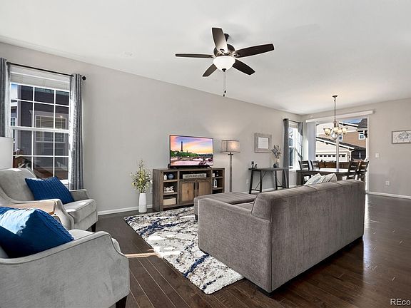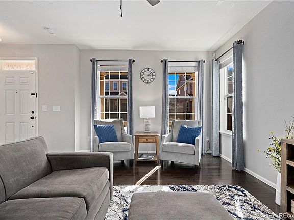 Beautifully maintained paired home in Fallbrook Farms! Situated in a quiet neighborhood with connecting walkways and nearby trails, this property boasts all the features you've been searching for. You'll immediately be impressed by the meticulous attention to detail and designer touches throughout. The main level features beautiful hardwood flooring that flows seamlessly from the open concept living room to the formal dining space, creating an inviting atmosphere for both everyday living and entertaining guests. The gorgeous kitchen is complete with recessed lighting, gleaming quartz countertops, stainless steel appliances, and a custom backsplash. You'll love the built-in bar nook with custom shelving and ship lap, perfect for enjoying a morning cup of coffee. The main floor laundry room is complete with added cabinetry for convenience. A charming coat/mudroom nook features custom cushioning and coat hangers for easy organization. Head upstairs and find a bright and airy loft space, ideal for a home office or relaxation area. The upper level also boasts two bedrooms and two bathrooms, including a luxurious primary suite with a tray ceiling and ensuite bathroom. Both bathrooms feature quartz countertops and upgraded features including accent tile in the tub and shower and upgraded rectangular sinks. Outside, discover a charming fenced concrete patio with a pony wall to hide the AC unit, providing a private outdoor space for enjoying sunny days or hosting BBQs. With an attached two-car garage and a tankless water heater, convenience and efficiency are always at your fingertips. Located just moments from the E-470 and I-25, as well as shopping, restaurants, and recreational facilities like Trail Winds and Carpenter Recreation Center, this paired home offers the perfect blend of urban convenience and suburban tranquility. Don't miss your chance to make this your home in Fallbrook Farms!