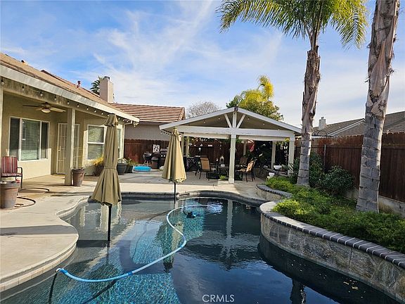 Davenport Ranch...Oasis Party Yard offers a large built-in Pergola for summer shade, covered patio plus a beautiful swimming pool with a water wall/fall, underwater ledges, etc.. Palms and flower beds! Very nicely updated *3 bedroom 2 bath home in desirable north Merced. Home located near UC Merced, shopping, schools and Davenport Park. This home has been updated in so many ways to include but not limited to: Kitchen remodel offers build-in convection over/microwave, electric cook top, granite counter tops, Ranch style double sink, walk-in pantry, recessed lighting, plus more…Breakfast nook with access to pool in rear yard. Large dining room. Laminate wood floors throughout with carpeting in bedrooms Recessed lighting, entry and dining room lighting. Living room has gas fireplace, ceiling fan, cathedral ceiling. Large *den/bedroom with ceiling fans. Central heat and air. Tile roof. 2 car attached garage, Large cement patio with cement walk around home. Fully landscaped yard with automatic sprinklers. Indoor laundry room located next to garage. *3rd bedroom converted into den. Must see to appreciate!