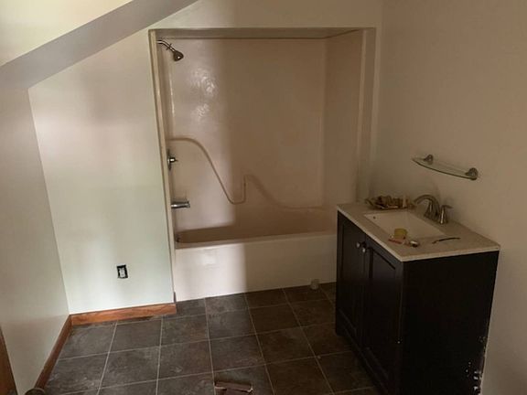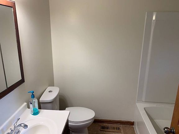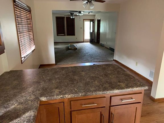 Entrance: Open front porch and brand new insulated leaded glass door leads to living room. Living Room: Painted drywall, taupe carpet, large open room to dining and kitchen. Window seats have extra storage, ceiling fan, plantation shades. Dining Room: Laminate floor, continuous decor as living room. Ceiling fan, plantation shades. Ktichen: Lots of dark cabinets with 6"stainless pulls. Dark quartz look laminate counter top. Snack bar open to dining room. Laminate floor, French door overlooks back deck and back yard. Bedroom: Painted walls, hardwood floors, plantation shades, closet. Bedroom: Painted walls, carpet floor, plantation shades, closet. Bath: White fixtures, vinyl floor, painted drywall, tub/shower combo. Nice. Upstairs: Bedroom has carpet, painted walls, three windows. Private bath has vinyl floor, vanity, nice tub. This upstairs room does not have heat ducts but is easily heated by natural air rising heat. A small window air will keep this room comfortable in summer. Basement: Block basement holds GFA/CAC, water heater and extra storage. Back yard has privacy fence. Detached 2 car garage with opener and long driveway for extra parking.