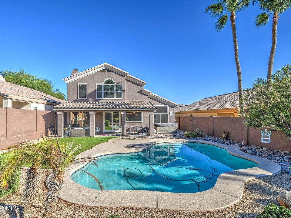 Bright, open entry welcomes you into this beautiful 5 bedroom, 3 bath home. Relax in custom hot tub for 8 at the end of the day! 2022 Roof, 2014 HVAC, New Pex Plumbing 2020, Exterior Paint 2022. Kitchen includes 42'' uppers, stainless steel appliances, granite counters, glass tile backsplash, an island loaded with storage & a HUGE walk-in pantry. Master bath includes newer cabinets, counters, fixtures & tile shower surround. Newer wood-look tile flooring. Enjoy your low maintenance back yard oasis that features a full covered patio, sparkling pool with artificial backyard turf. All appliances convey. Prime location within walking distance to A Rated schools, shopping, & dining. Within minutes to South Mountain hiking/biking trails. The perfect place to call home!