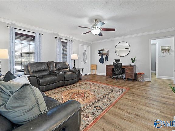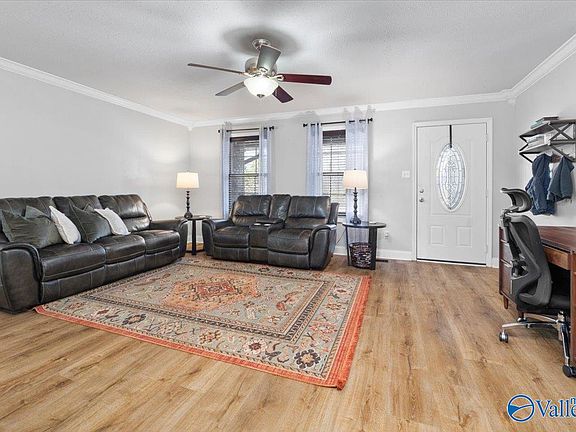 This charming 3 bedroom, 2 bath full brick home provides a country setting with close proximity to shopping, dining and work. Cozy front porch welcomes you upon arrival. Spacious Family Room features LVP floors and crown molding. Eat-in Kitchen offers LVP floors, recessed lighting, pantry and ample counter & cabinet space. The Primary Suite is a true retreat, featuring a Glam Bath with double vanities, shower, whirlpool tub and large walk-in closet. Both secondary bedrooms with new carpet and ceiling fan. Outside, enjoy a patio overlooking the fenced-in backyard, perfect for relaxing or entertaining. Convenient drive to MidCity, Bridge Street, Redstone Arsenal, Research Park and more!