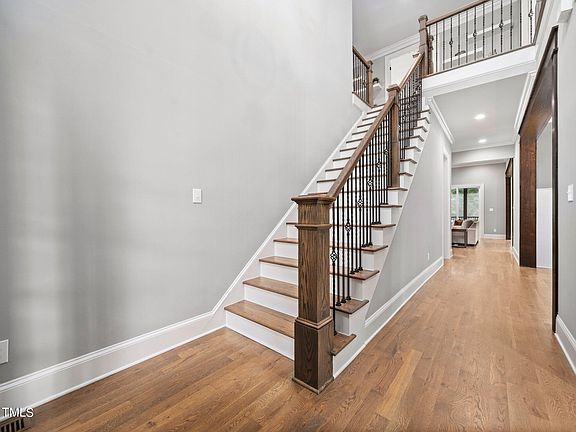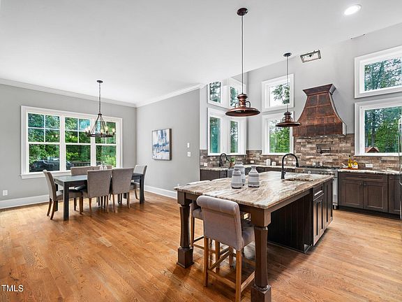 Back on the Market. One-of-a-kind custom estate nestled on private lot in the heart of Wake Forest. From the moment you step inside, you'll be captivated by the stunning rustic elements that define this home. Hand-hewn mantel, exposed beams, reclaimed wood and metal finishes are just some of the features that create a warm and charming atmosphere. Offering exceptional craftsmanship and thoughtful design at every turn, there's no other home out there like it. The open concept floor plan blends kitchen, dining and living spaces which are highlighted by soaring ceilings with exposed wood beams and tons of natural light. A guest suite, secondary dining room, primary suite, laundry/mud room and screen porch complete the first floor. The gourmet kitchen features stainless steel appliances, apron sink, brick tile, imported copper range hood, pot filler, gas range, built-in and walk-in pantries, butler pantry, leathered granite and a large island for entertaining. The primary suite features a shiplap wall, trey ceiling and customized barn door entry to ensuite. The ensuite is just pure luxury. a massive herringbone tile surround walk in shower with seat and pebble stone tile floor, tons of room in the custom cabinetry designed to store everything at your fingertips, but off the countertops. The free standing tub has its very own nook and is highlighted by tiled walls and a chandelier. The large primary closet connects to the laundry room complete with cabinetry and tub sink. The second floor has 3 bedrooms, a bonus room, 2 full bathrooms and multiple unfinished storage space. The basement is where all the fun happens! Completely custom bar, lounge space, arcade room, home gym, theater, full bathroom, home office and even more storage complete the walk out basement. Lower patio overlooks the full fenced in private yard. HOA includes pool, playground, gym, fishing pond and greenway access. Exceptional craftsmanship and unique features make this property truly special. Don't miss this rare opportunity to call this one home.