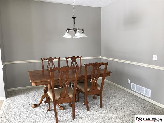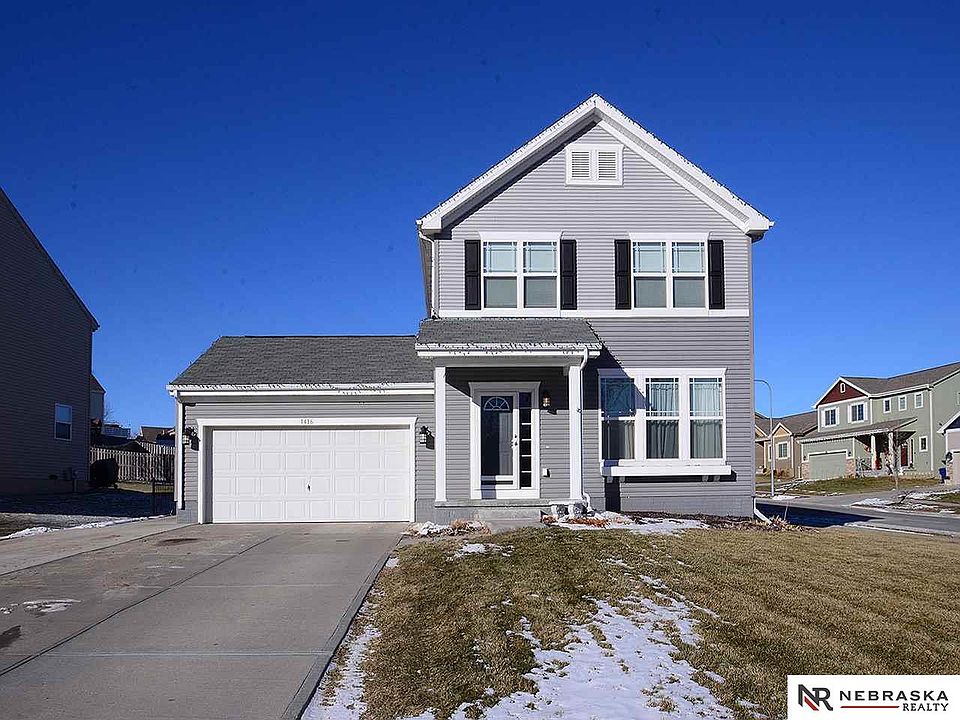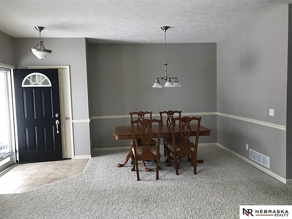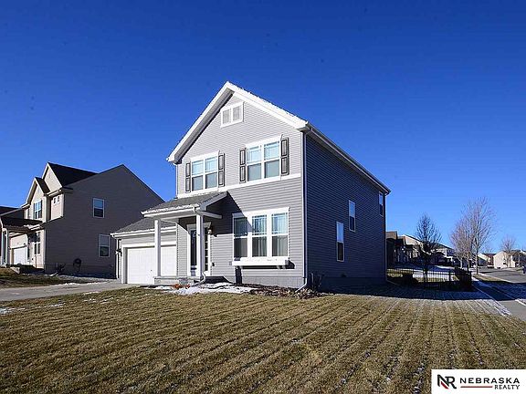 Open Sunday 1-3 pm. Great 2-story house in Elkhorn schools. Maintenance-free vinyl siding, extra parking pad, large corner lot with iron fence and sprinkler system. New interior paint throughout. Kitchen has newer microwave, dishwasher and plenty of storage in large pantry w/access to beautiful backyard w/large stamped-concrete patio with seating ledge. Half-bath on main floor has custom cabinet. Upstairs bath has upgraded granite counter and tile floor. Large master bedroom with walk-in closet and master bathroom with double sinks. Large finished basement with custom wetbar and flex room that can be used for office or toy room.