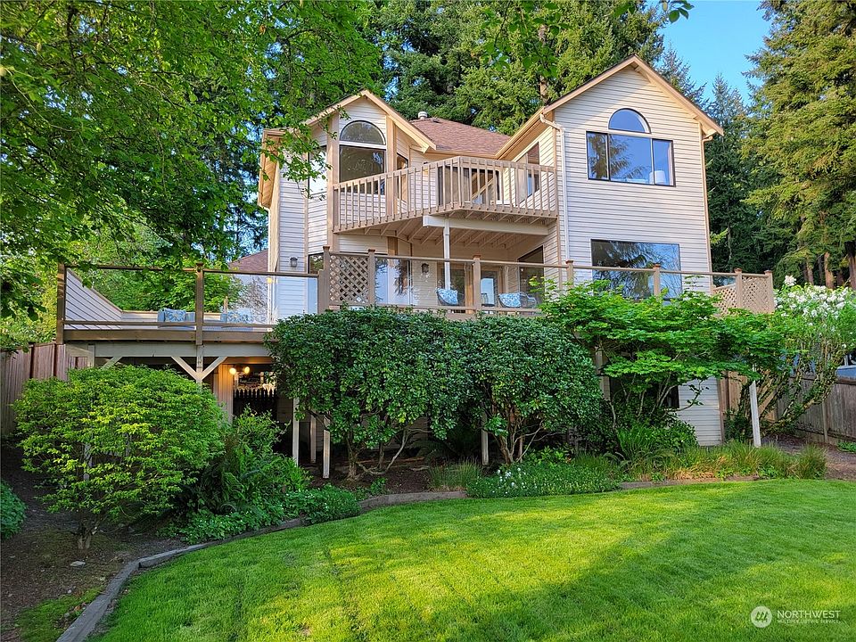 Waterfront living on beautiful Lake Stickney awaits you! Once you enter the woodland setting and arrive upon this lovingly maintained spacious home with 3 car garage, the property unfolds like an emerald carpet down to the lake for all your lakefront activities. Main floor includes study/den with vaulted ceilings, two-story living room, formal dining room, and open gourmet kitchen with family room, captivating views, decks & sunny south-facing exposure. Upper level includes huge primary suite w/bath, two bedrooms, 2nd full bath & vaulted ceilings. Lower level features entertainer’s rec room, additional bonus room, & tons of storage with workspace. Close to I-5, I-405 and Mukilteo ferry. Convenient to everything yet feels like a world away.