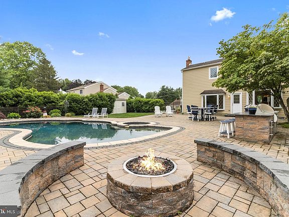 Summer is here and 1416 Revere Street is ready to make summer memories! Welcome to this thoughtfully updated and infinitely welcoming home. In the two-story foyer, classic random-width wood floors flow throughout the entryway into the spacious and light-filled dining room, which is large enough for hosting holiday gatherings with ease. On the other side of the foyer, a breezy and comfortable living room with sunny bay window offers a step up into the eat-in kitchen or entrance through French doors into the family room. Here, enjoy summer views of the yard and pool or, in cool weather, the ambiance of sitting beside the glow of the fireplace. Access to the yard is conveniently located between the family room and the adjacent kitchen, which has a matching bay window into the yard. Light and neural cabinetry lends a sense of ease and spaciousness to the kitchen's work spaces, which are finished off in durable Corian countertops. Ample prep spaces, pantry closet, center island and a beverage center with glass-front cabinets with wine storage will please the home chef. Finishing the main level are a powder room and a large mudroom/laundry room with durable floors. Upstairs, an open hallway leads to three good-sized bedrooms and a shared full hall bath, plus a main bedroom with hardwood floors, adjacent sitting room, walk-in closet, and beautifully updated en suite bath. In the finished basement, opportunities abound for a playroom, media room or more and include a semi-separate home office space with built-in bookcase and ample storage spaces. The real show-stopper of this home, however, is not in the home but in the backyard: your own spa-like pool oasis, complete with exquisitely designed and expansive paver patio. Grill for guests and serve at the built-in outdoor bar or dine al fresco just steps from the kitchen. The sprawling patio ensures space to spread out and soak up the sun by the pool, relax to the crackling fire in the fire pit or the babbling of water in the nearby waterfall feature. The pool itself is beautifully finished and includes a separate spa. The backdrop of professional landscaping is the final jewel in the crown of this remarkable yard. Desirable Pennsbury School District, and close to amenities, commuting routes, and the small-town appeal of Historic Yardley Borough.