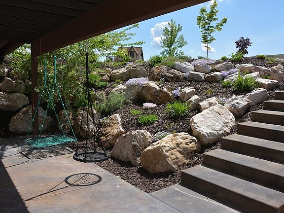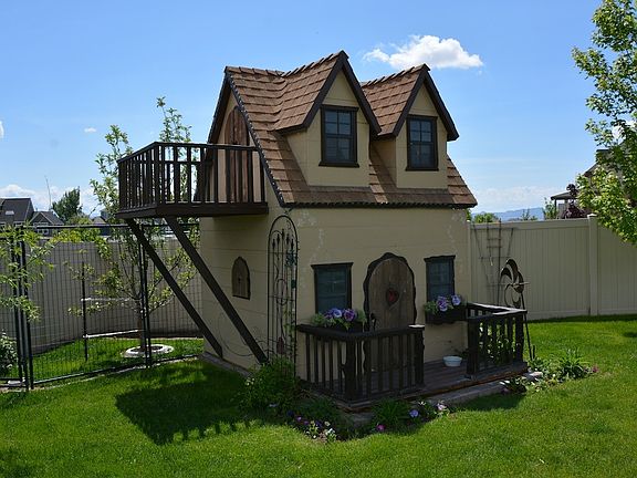 This has it all for an amazing low price! Open concept great room, travertine, granite, 4 car garage, huge bonus room, loft office and or play area, main floor master suite w/ laundry in massive walk in closet, gorgeous den, intercom, wired for speakers & central vac, custom wood shutters. Huge potential lower level plumbed and framed for 3 bedrooms, family room, 2 baths and huge theatre, walkout lower level, darling 2-story playhouse, 5 bedroom, 4 baths including jack & jill, Juliet balcony, huge RV pad, fully fenced yard, low maintenance deck, three patios, , storage shed, impecably landscaped. Two community swimming pools, clubhouse, volleyball and tennis courts. Must see!