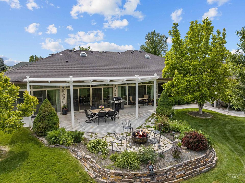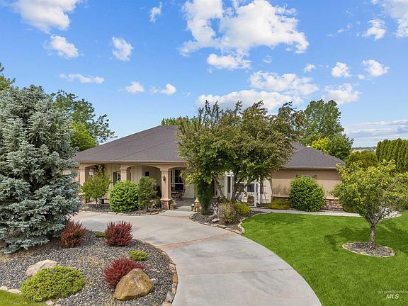 Upon stepping onto this perfectly landscaped one-acre property, you'll be greeted with the comfort of a well-designed home. Primary home features a split-bedroom layout with a full master suite, 2 guest bedrooms and an additional office/den/bedroom with 2 full bathrooms, formal living and dining rooms, climate controlled sunroom, and a custom kitchen adjoining the great room overlooking the beautifully landscaped backyard. Home features include built-in speakers, tile and hardwood flooring, security system, handicap accessible, double ovens and so much more. The private secluded RV shop with 30 amp hookup includes an additional living space with a full bathroom and large loft area. The mature, park-like, back yard is sure to make you feel at home and 10 laps around the concrete path meandering the perimeter of the yard equals one mile. The oversized three-car garage was designed to accommodate a vehicle with a handicap ramp. Triple Crown subdivision is one of Nampa's most desirable subs with beautiful homes!