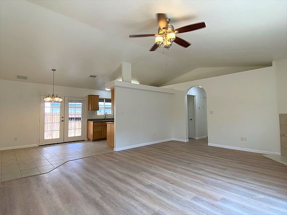 Newer home built in 2006 located in Ridgecrest Heights! 3 bedrooms and 2 baths with a finished 450 sq ft. 2 car garage! Spacious living room with vaulted ceilings, newer LVP flooring, french doors to the south sideyard and a fireplace. Tile flooring in the dining room with french doors to the covered patio. The kitchen has tile flooring, and corian countertops. The two guest bedrooms have lighted ceiling fans and vinyl plank flooring. Large master bedroom with french doors to the covered patio and an in-suite bathroom. Evap. cooler is on the ground for easy maintenance. Fully finished garage.