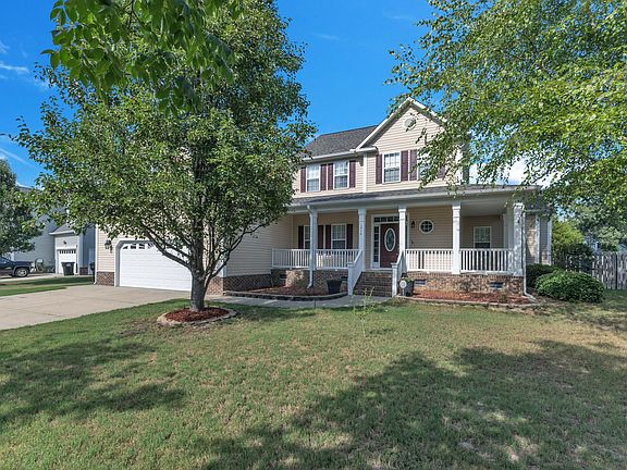 Looking for a fabulous new home in Garner with no city taxes, a gorgeous lot, and a sought after location? Look no further than this stunning, FRESHLY PAINTED, 4 bedroom, 3.5 bathroom home that offers a spacious 2798 sq/ft of living space and well-designed floor plan. The main level has many desirable features, including hardwood floors, a first floor primary suite with double-vanities, separate dining area, an oversized kitchen, and an open concept view into your beautiful living room. The second floor boasts 3 bedrooms and 2 full baths, a huge bonus/recreation room, and an additional room that is perfect for an office/study or secondary play room. Outside, you'll find a beautifully landscaped, fenced in back yard, including a garden, pear and peach trees, mature trees, with an oversized covered porch and outdoor patio for all your entertaining and outdoor dining dreams! The wrap-around front porch and secluded cul-de-sac lot make this home one you truly do not want to miss! Newer roof (2019), siding (2019), and main level HVAC (2024). Close to HWY 50, the new 540, 40/42 and Interstate 40.