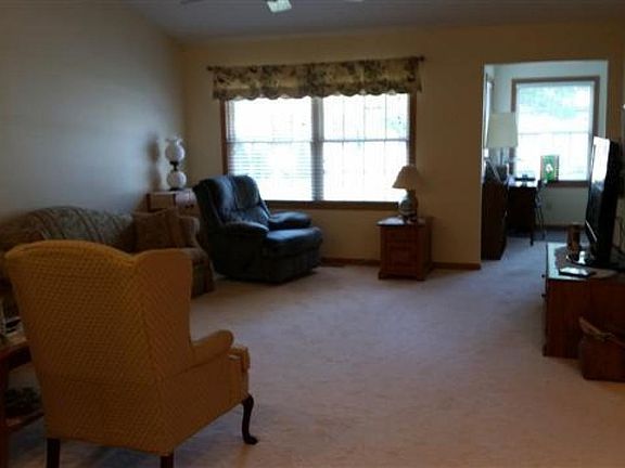 Vaulted ceiling in Living Room. Hickory cabinets, pantry closet. 9 ceiling in kitchen. Breakfast bar open to living room. Laundry off kitchen. Mater bedroom has private bath with walk in closet. 2nd bedroom with walk in closet. ceiling fans throughout. Freshly painted and newer carpet. 13x16 Four season room. HOA fee $156 monthly.