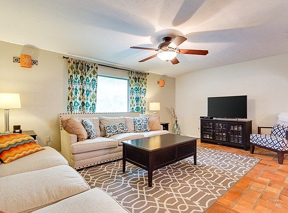 Spanish stucco colonial style home is located near shopping centers, restaurants, and parks! This home has 2423 living square feet home and sits on almost a half acre lot with beautiful mature trees. The home has a courtyard entry with wrought iron gates, spacious open living & dining areas, large windows for natural light, storm shutters, accent lighting, arched doorways and Saltillo tile. The kitchen is updated with granite counter tops, bar top area, ample cabinet space and a private nook. The house has 3 bedrooms, large game/bonus room that could double as a 4th Bedroom and an over-sized laundry room. The exterior has 3 covered patios, over-sized garage with workshop area, additional storage area and extra shed! This home has more than enough room for entertaining! Must see in person!