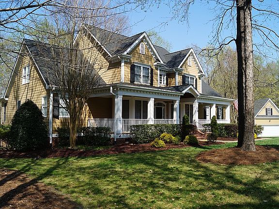 Stunning southern farmhouse on 1.2 acre cul-de-sac lot with rear 22 acre HOA preserve! Exquisite details with double height ceilings in foyer, family and breakfast nook. Coffered ceilings in dining and living rooms. Brazilian cherry floors throughout first floor and partial second floor. French doors throughout. Immaculate condition with endless architectural details. Lots of windows and natural light. Large first floor master suite. 4 bedrooms, 3.5 bathrooms. 2 car attached and 2 car detached garages. 3738 SF in main home with 327 SF of additional space above detached garage. Estate landscaping surrounding large covered front porch, large covered rear terrace, screened terrace and open deck. New modern kitchen (2020) with granite/glass backsplash and new appliances. New bathroom counters (granite/quartz) and faucets (2020), tankless water heater (2019), roof (2018), Geothermal Heating/AC (2015), Additional insulation and encapsulated crawl space (2017), WiFi sprinkler system 2017. A family homeowners dream in the fast growing area of South Raleigh, 20 minutes to Downtown, easy access to the new 540 expressway, but 1/2 mile from it for continued tranquility.