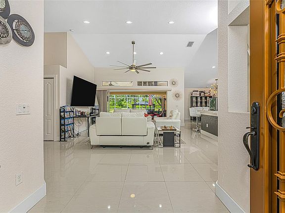 Paradise awaits in this beautifully remodeled home located in the desirable waterfront community of South Gulf Cove! The tropical landscaping, decorative columns, tiled front porch, and double glass front doors with decorative wood accents are just the beginning. Upon entry, you will be wowed by the large shiny porcelain tiles in a neutral color, soaring vaulted ceilings, upgraded light fixtures, modern ceiling fan, and natural light provided by both the upper windows and the pocketing sliding glass doors that gives you plenty of additional entertaining space by opening the living room to the lanai and pool area. The kitchen in this home has been well remodeled with a flair for modern style. With waterfall quartz countertops, solid wood cabinets, a breakfast bar, stainless steel appliances, including a double oven, a wine refrigerator, and a trash compactor, this kitchen will impress even the most discerning buyer. Featuring 5 bedrooms and 4 bathrooms, you will have plenty of space to accommodate all your family and friends, and even has two luxury designed master suites. Both master suites feature hardwood flooring, tray ceilings, upgraded ceiling fans, French doors with lanai access, and a luxury ensuite bathroom each with a jacuzzi tub, walk-in shower, and double vanity with quartz countertops. There are hardwood floors, upgraded ceiling fans, and vaulted ceilings in the 3 remaining bedrooms. The additional bathrooms include upgraded vanities with quartz countertops and one of them provides both indoor and outdoor access from the lanai for added convenience when enjoying the pool and spa. This home has many upgrades that you can check off your must have list including: 2018 kitchen appliances, a 2021 refrigerator, 2020 washer and dryer in the laundry room with a utility sink and storage cabinets, a new 2022 water heater, an irrigation system, security system, multiple ceiling fans on the lanai, and hurricane shutters for the entire home! South Gulf Cove is well planned with a community boat ramp, several parks and walking trails, a learning garden park, and the option to join the HOA for the use of the community clubhouse and enjoy many of their yearly events and activities. Once you launch your boat, you can spend the day on the water enjoying the beautiful white sandy beaches, world-class fishing, or simply stopping at a waterfront restaurant. If you prefer to stay landlocked, you are conveniently located near several golf courses, dining options, and a variety of shopping experiences. After you have enjoyed a day out, you will love coming home to your sparkling heated pool and spa situated on an oversized lanai that has been well thought out to ensure you have everything needed for both relaxing and entertaining at home. Do not let this beautiful South Gulf Cove home slip away, schedule your showing now.