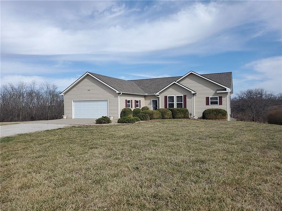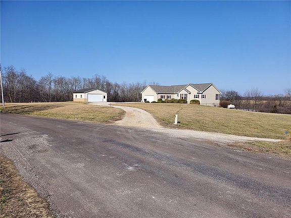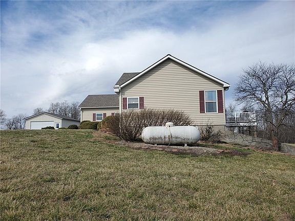 If peace and quiet is what you are after, check this one out! Located halfway between the KCI Airport and St. Joseph. This beautiful home has loads to offer! From the composite deck you can view the stars at night and enjoy the daytime views under the retractable awning. This floor plan boasts an open concept with a large kitchen/dining/living room area. The main bedroom has a large private bathroom with a shower and jetted tub. A walk in closet is the finishing touch. The main floor also has two more bedrooms and a full bathroom for guests. The basement is large and finished with a walkout door and an entrance to the basement garage/workshop! The utilities are located on the main floor beside the door leading to the two car garage. Did I mention the detached 24'x30' garage with the concrete floor and power? This home is a must see!