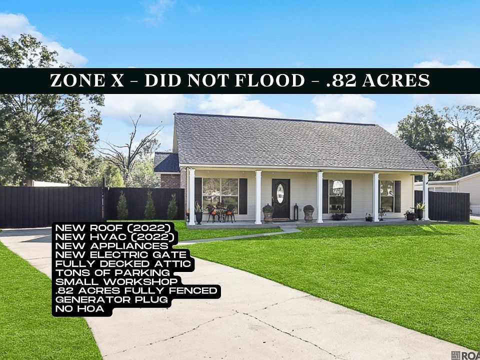 $5000 Price Improvement! *See attached video tour* Welcome to this beautiful home on just under an Acre! Sitting on an extra large .82 acre lot, this home does not require flood insurance and has never flooded. This home is 3 bedrooms, and 2 full baths, under a new roof (2022) with a newer HVAC system (2022.) There is also an extended back patio, fully fenced yard with a fenced side yard, tons of parking space, a rear carport with storage room, an electric driveway gate (2023), and a pergola. This home has a generator plug, along with all updated lighting throughout. The kitchen is a chef's dream with tons of cabinets, counter space, a smart fridge, black stainless steel appliances, a large black farmhouse sink, and custom pot & pan racks. This home has been meticulously maintained for its next owners and is turn key ready. The attic has tons of storage with full decking! This beautiful style is a unique and rare find, you don't want to let this one pass you by! Eligible for 100% financing! Schedule your private showing today!