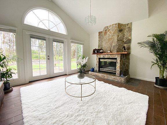 * Fireplace in the formal living room with soaring high ceilings and lots of windows to let in the light.