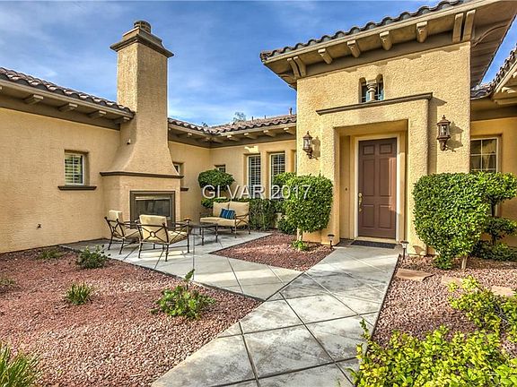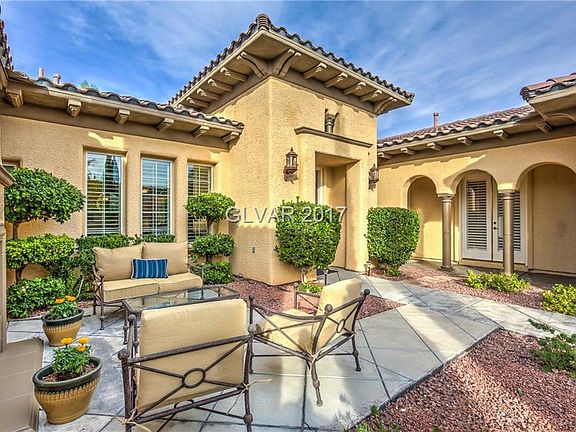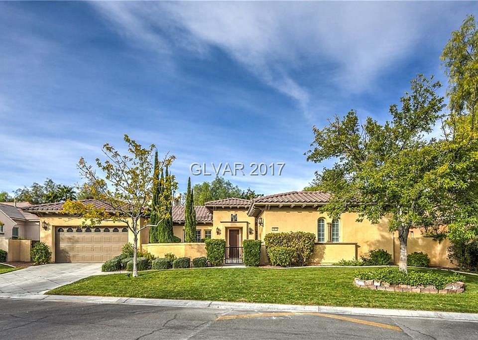 The Vineyards, A Prestigious Guard Gated Summerlin neighborhood, lush landscaping, numerous parks and common areas. Upscale Christopher built single story. Courtyard entrance with fireplace, nicely updated with gorgeous tile with wood like design. Large master, double doors, dual closets, amazing office with built-ins, walk-in closet and 1000 bottle wine cellar. Over 13,000 sq ft, pool and spa and very secluded, covered patio, BBQ