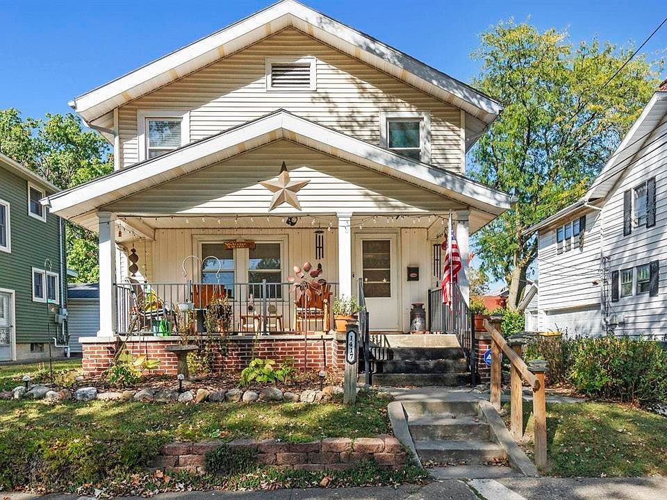 **OPEN HOUSE Sunday, April 6, 1:00-3:00**Welcome to your *NEW* home—a two-story with historic character and woodwork intact with modern upgrades: *NEW* water heater (1 year), *NEW* furnace/AC (6 years), *NEW* electrical panel/wiring (10 years), *NEW* roof (10 years), *NEW* sump pump (<1 years), *NEW* windows (5 years), *NEW* kitchen (15 years), and *NEW* bathroom (1 year)! Nestled in a picturesque neighborhood, this beauty features a spacious layout, perfect for both entertaining and everyday living. High ceilings, original moldings, and hardwood floors create an inviting atmosphere throughout. The main level boasts a living room, a nicely updated kitchen with modern appliances, and a dining area bathed in natural light. The full basement offers washer & dryer (all appliances stay but not warrantied) and a dry space for hobbies, crafts, or additional storage. Step outside to your covered porches (front and back!), 2 car garage, and fenced yard. A shed provides additional storage. Upstairs, you’ll find nicely sized bedrooms that offer both comfort and style with original light fixtures throughout, along with a beautifully updated bathroom that seamlessly blends vintage charm with contemporary finishes. With a two-car detached garage, there’s ample space for vehicles or hobbies. This home truly offers the best of both worlds—historic charm and updated everything. Did we mention the houses has a maintenance free exterior? Don’t miss the opportunity to own a piece of history with all the modern amenities you desire at a price to can afford!