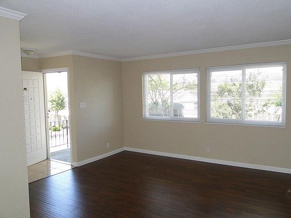 This Lovely 2BD 1BA single-story unit has just been renovated and awaits a new tenant. Nice open kitchen, granite countertops, newer appliances including refrigerator and microwave, new fixtures, and tile floor in the kitchen. New Hardwood floors throughout. The bathroom has a tile floor, shower, and large vanity. The Master bedroom has a walk-in closet and sink vanity in the bedroom. Window treatments, crown molding, lots of storage, and new paint gives this unit a rich feel. The laundry facility is close to the unit, covered parking, community pool, and much more. Highly sought-after location, close to shopping, public transportation, and freeway access. Move in by August 1st and recieve 1/2 off a moth of rent